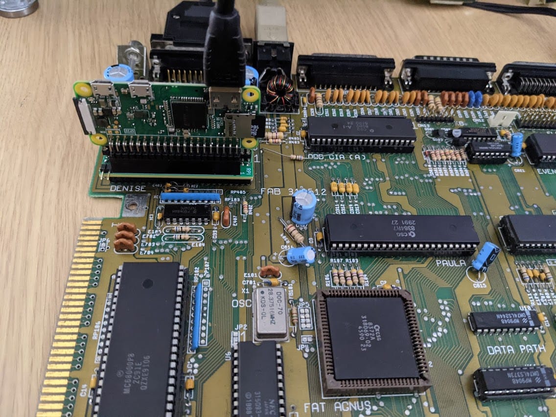 Denise sits on the chip socket there, there are pins underneath to go into the Denise socket and the Raspberry Pi goes into the header at the top.