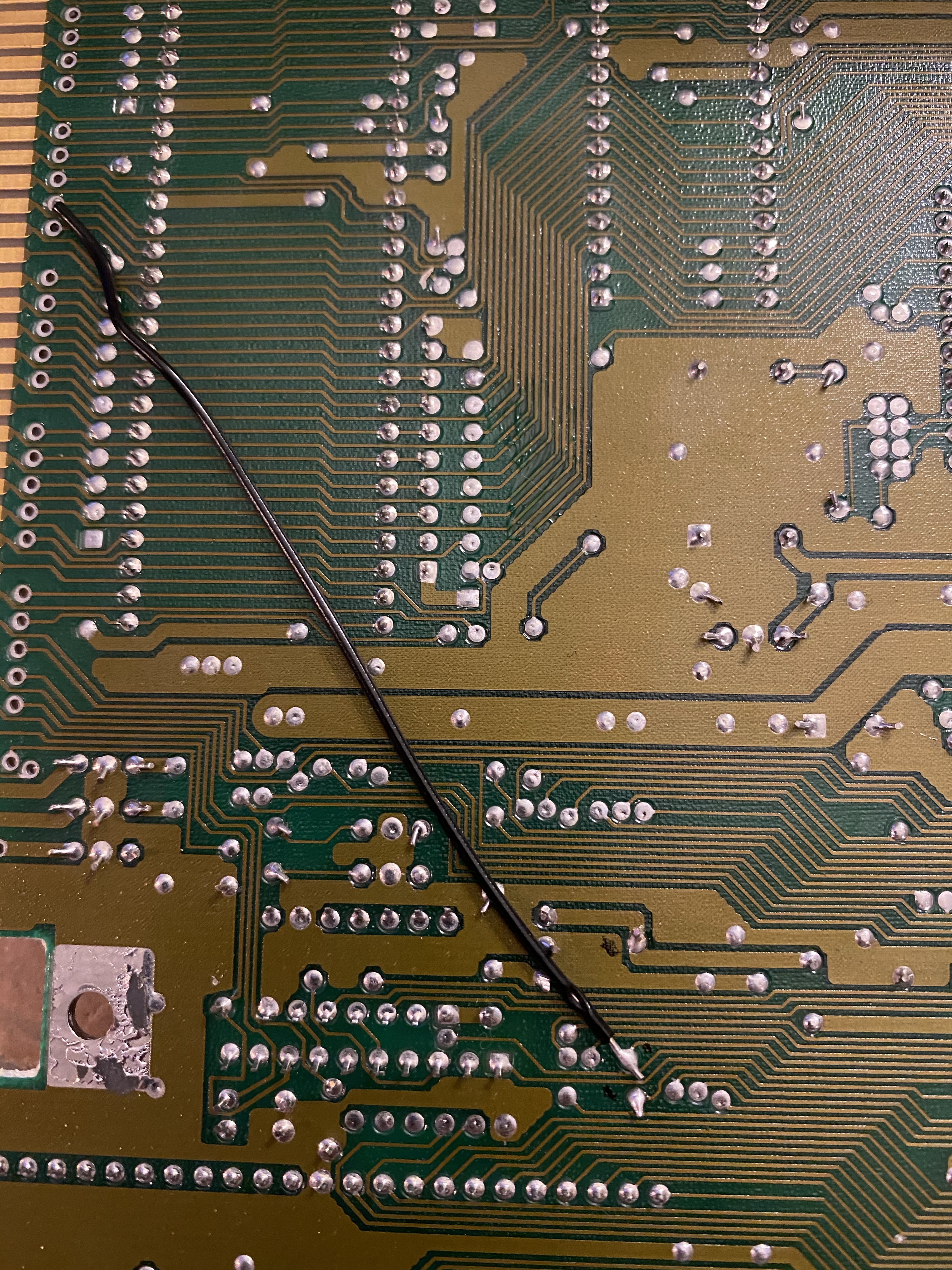To make this fix more permanent, on the CPU side there is an expansion edge connector which also gets the RST line, and there is a neat through-hole here I could use. On the Gary side I used a pad for the RST line under the resistor where the breakage is.