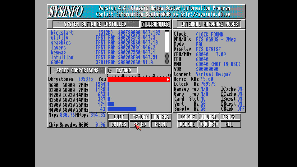 Emu68 defaults to 68040 and my Musashi setup is using 68020, but this doesn’t really matter as both will emulate at the fastest speed possible. It only makes a difference for the additional instructions of the CPU.