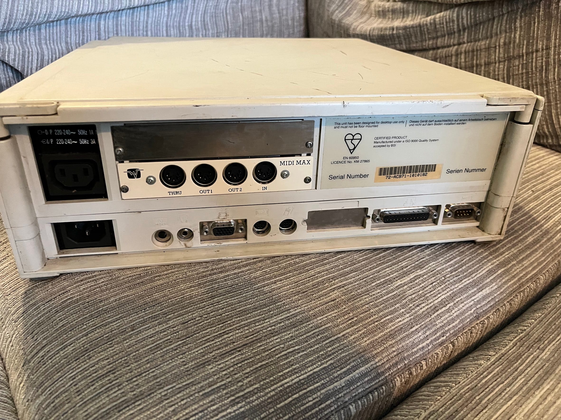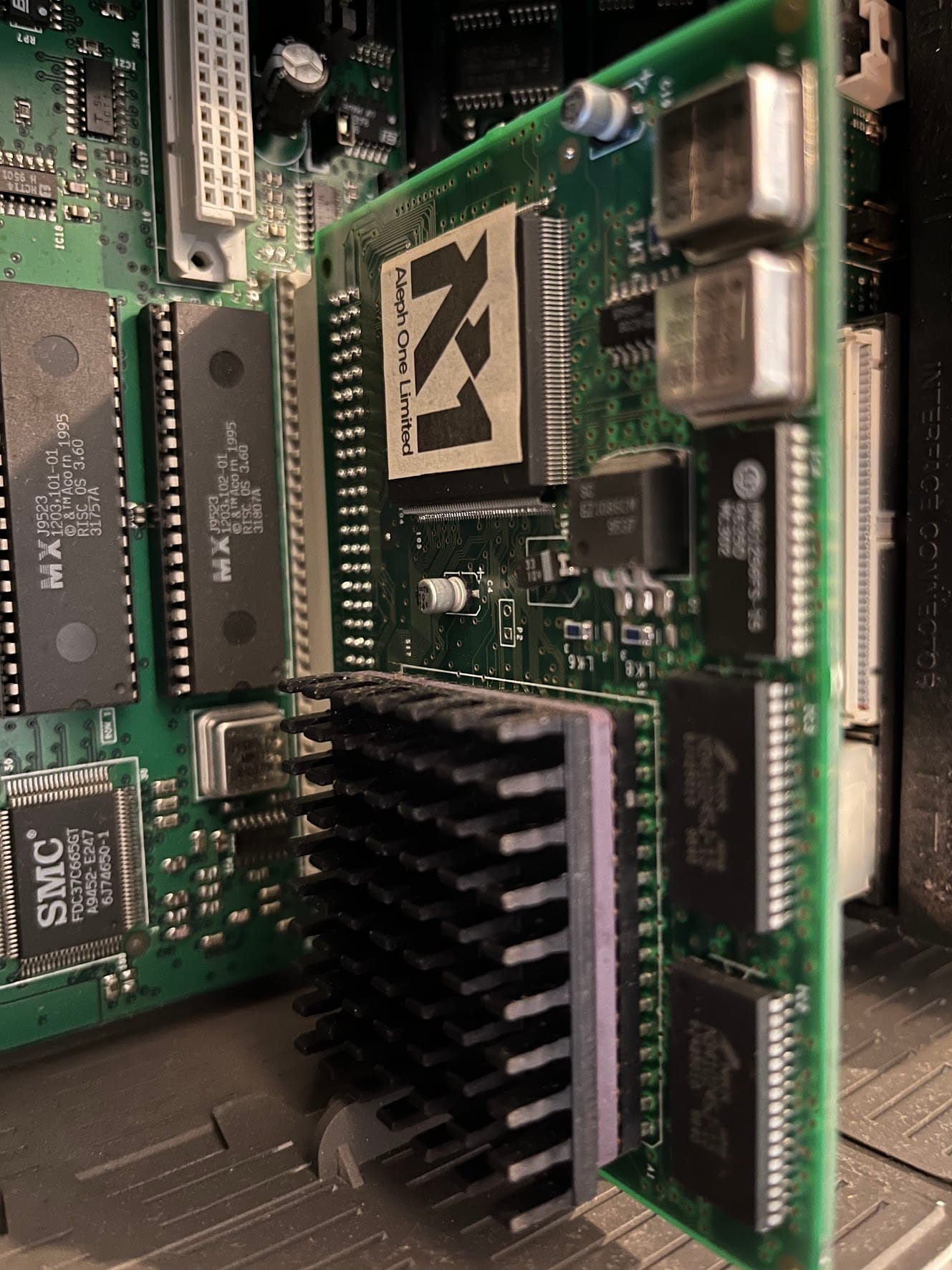 Inside we have a MIDI “Podule”, the ARM 710 CPU card (this was actually rattling around loose inside) and a 486 co-processor card. Due to the heatsink I can’t tell at this stage which 486 it is. It also has RISC OS 3.6 ROMs which is expected for this era. I believe these ROMs should give good compatibility unless I wish to upgrade to a StrongARM processor card, then I would need to use 3.7 as a minimum.