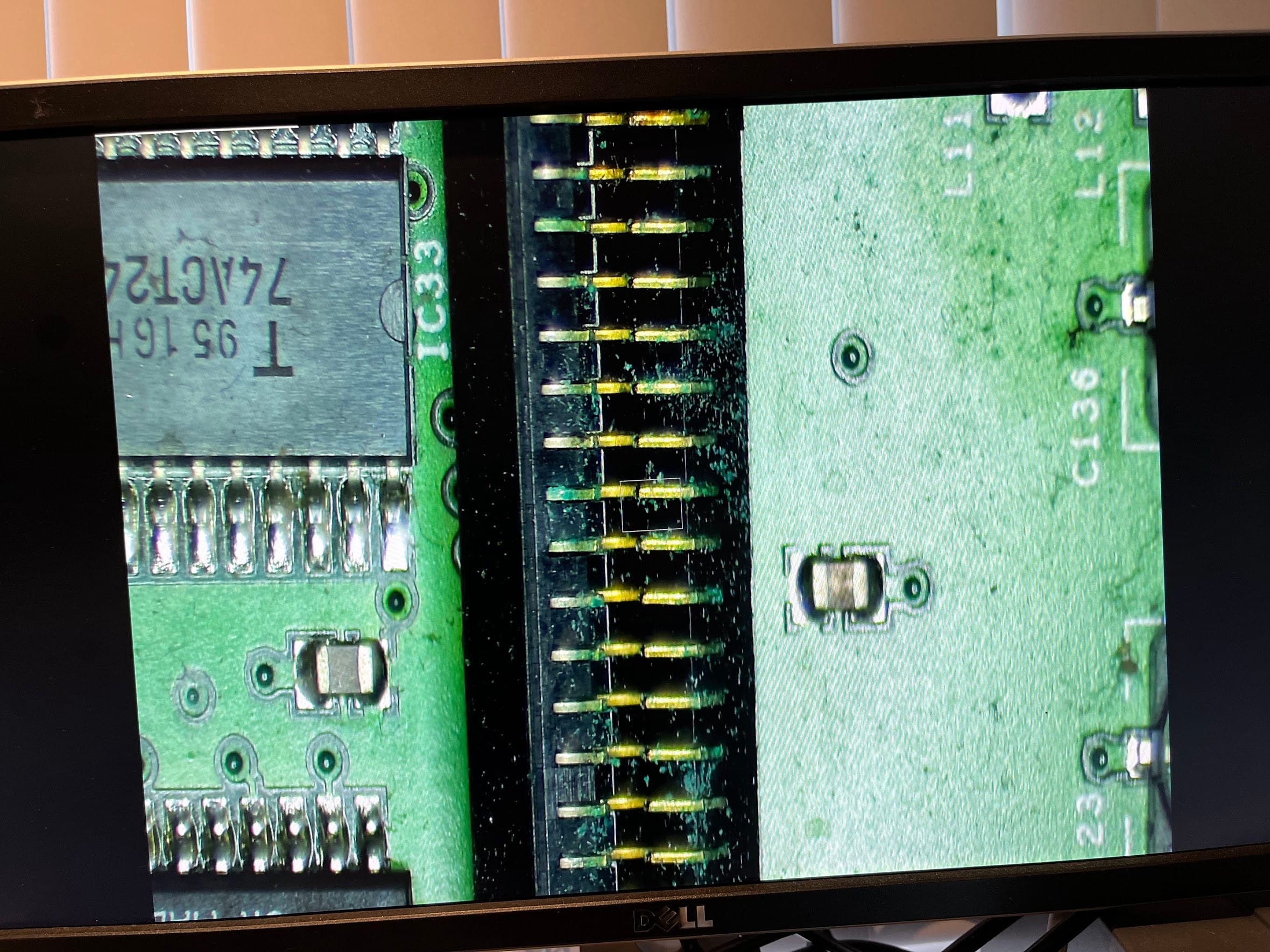 The second two are photos of my microscope screen after I cut the battery off. The passives around the battery have some corrosion around them, these are for the CMOS chip’s power. The more concerning part is one of the SIMM sockets and one of the SIMMs have corrosion over them.
