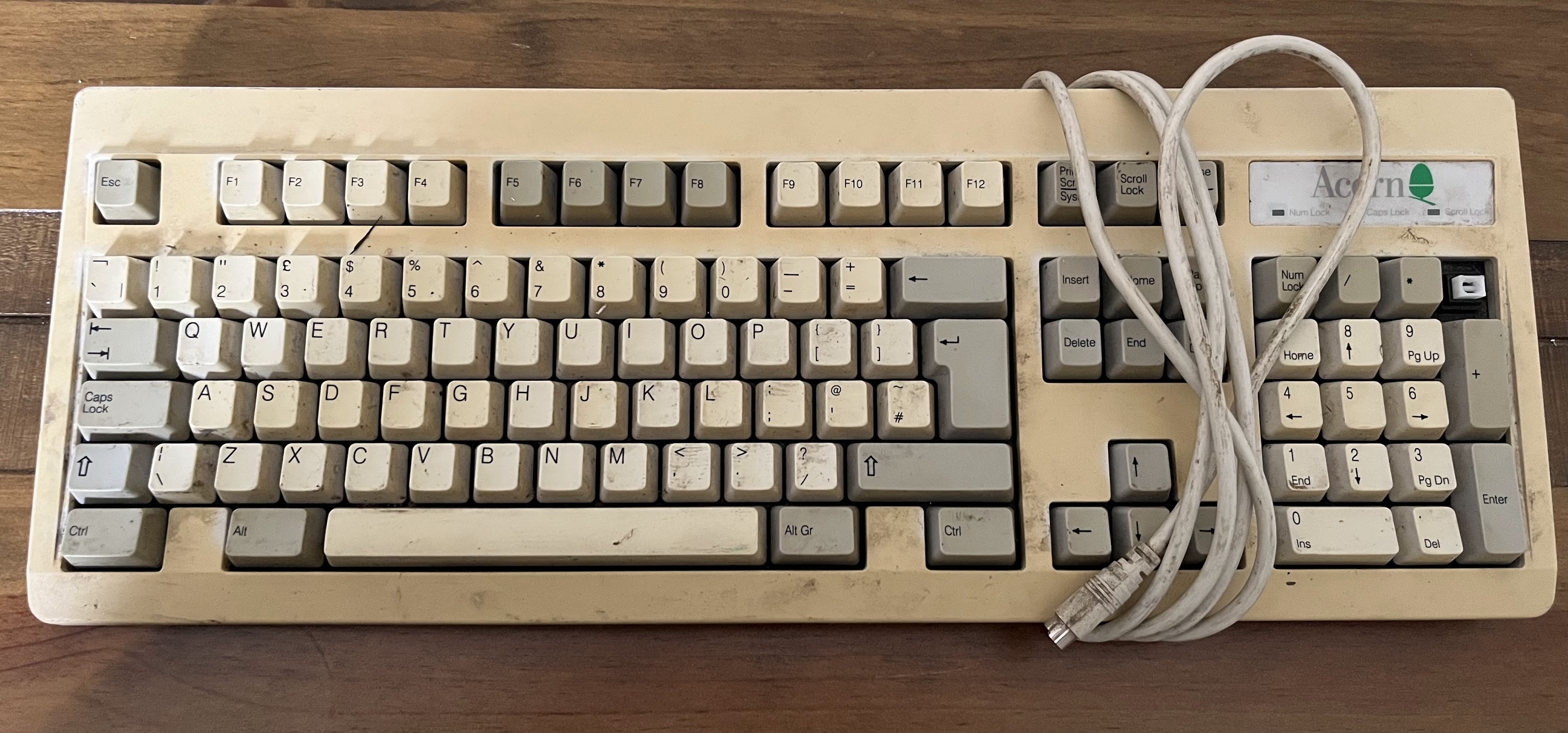 As you can see, it looks like it has been kept in a garage or somewhere similar. The plastics are going to need quite a bit of cleaning and the keyboard is missing a key. I might clean the keyboard up and obtain the missing key, or replace the whole thing. The keyboard is essentially an Acorn branded standard PS/2 keyboard.