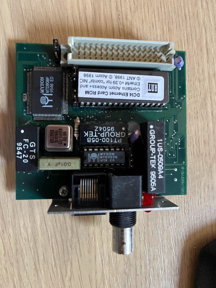 I acquired a “Myson” based network module for RiscPC. The RiscPC motherboard has a special socket to fit a card such as this one and the ports are exposed to the back.