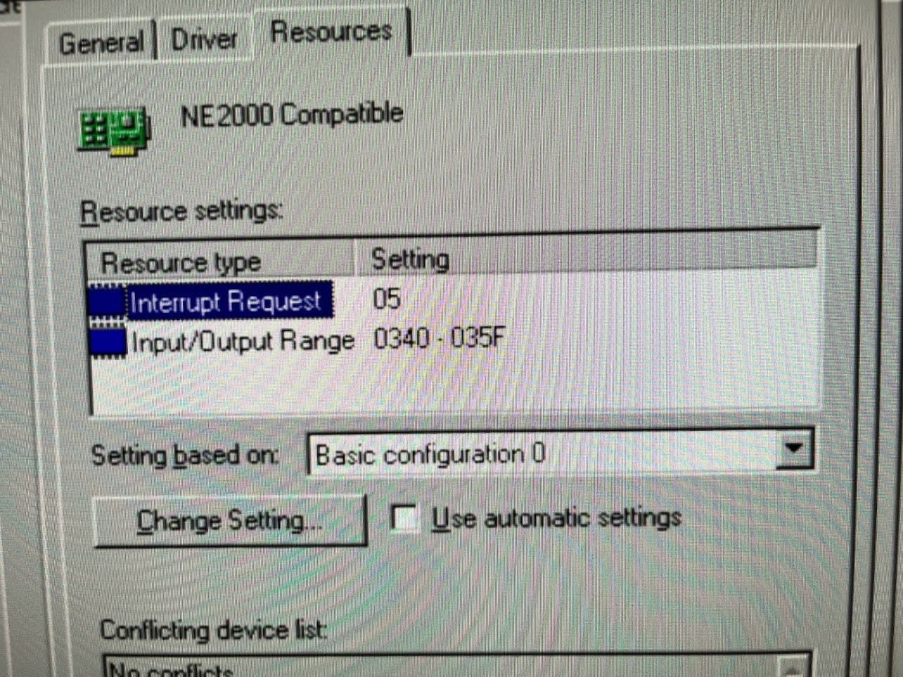 In Windows, when you scan for new devices you will get an NE2000 network card to show up. For me this didn’t work properly at first because it didn’t auto-detect the IRQ. I had to manually set this.