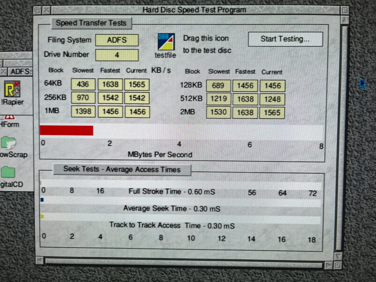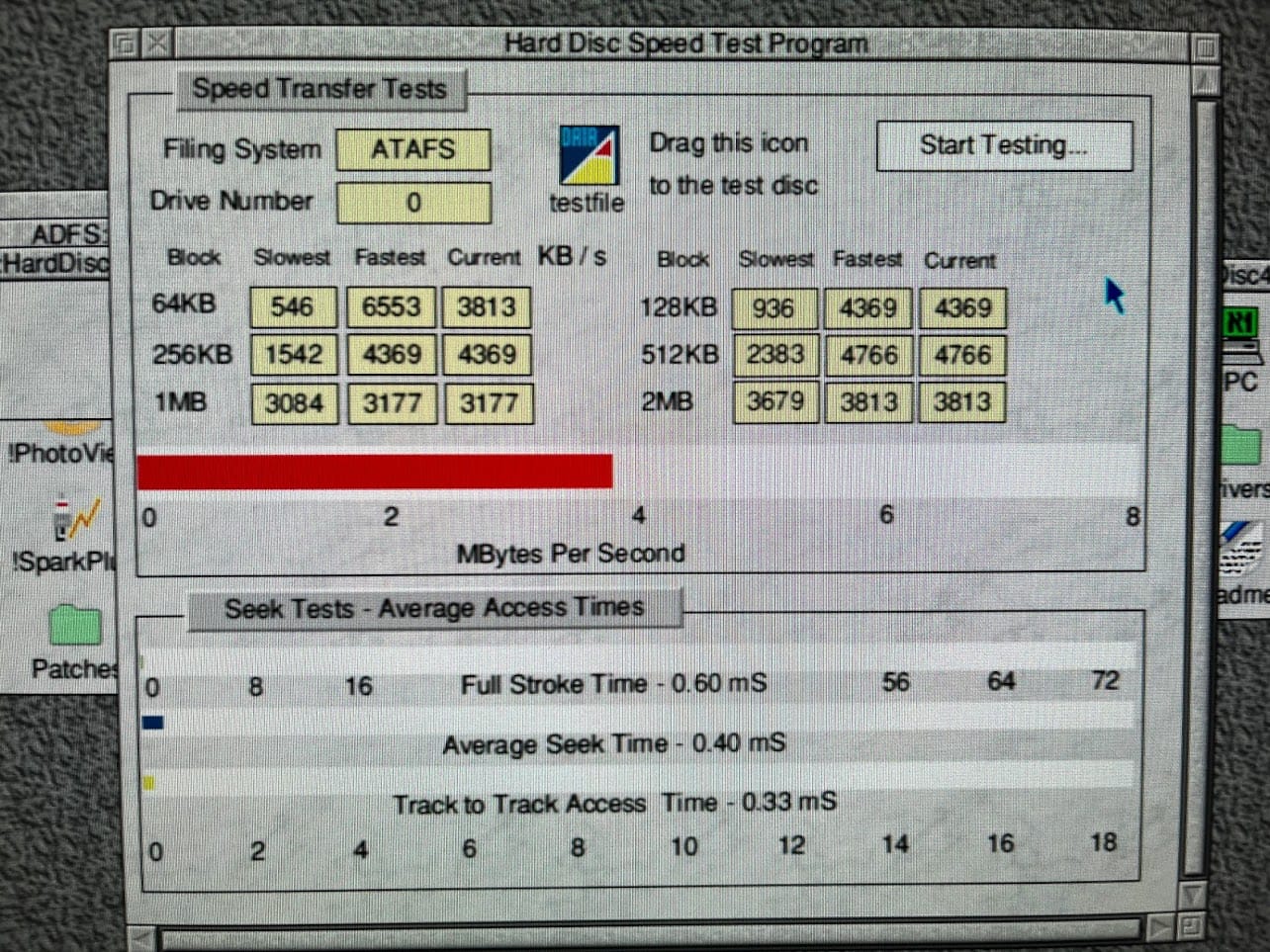 I’ll need to sort out the cabling and somewhere for that SD card reader to sit, but it functions well for now. As for speed, the ADFS is the SD card on the internal IDE and the ATAFS is connected to the Yellowstone. They both use the same interface and model of SD card.