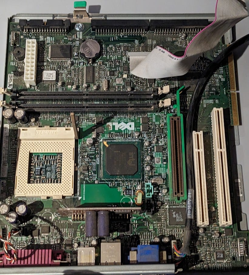 I removed the motherboard from the Dell as I saw it had what I thought was an ATX format. I checked the pinout of the PSU and it was ATX (unlike some Dells). The ports and card slots appeared to be in an ATX format, even though this had a daughter board, the slot for that could be used as a standard PCI slot. There is also the possibility to expand it to add more PCI slots as this motherboard was used in a tower case as well.