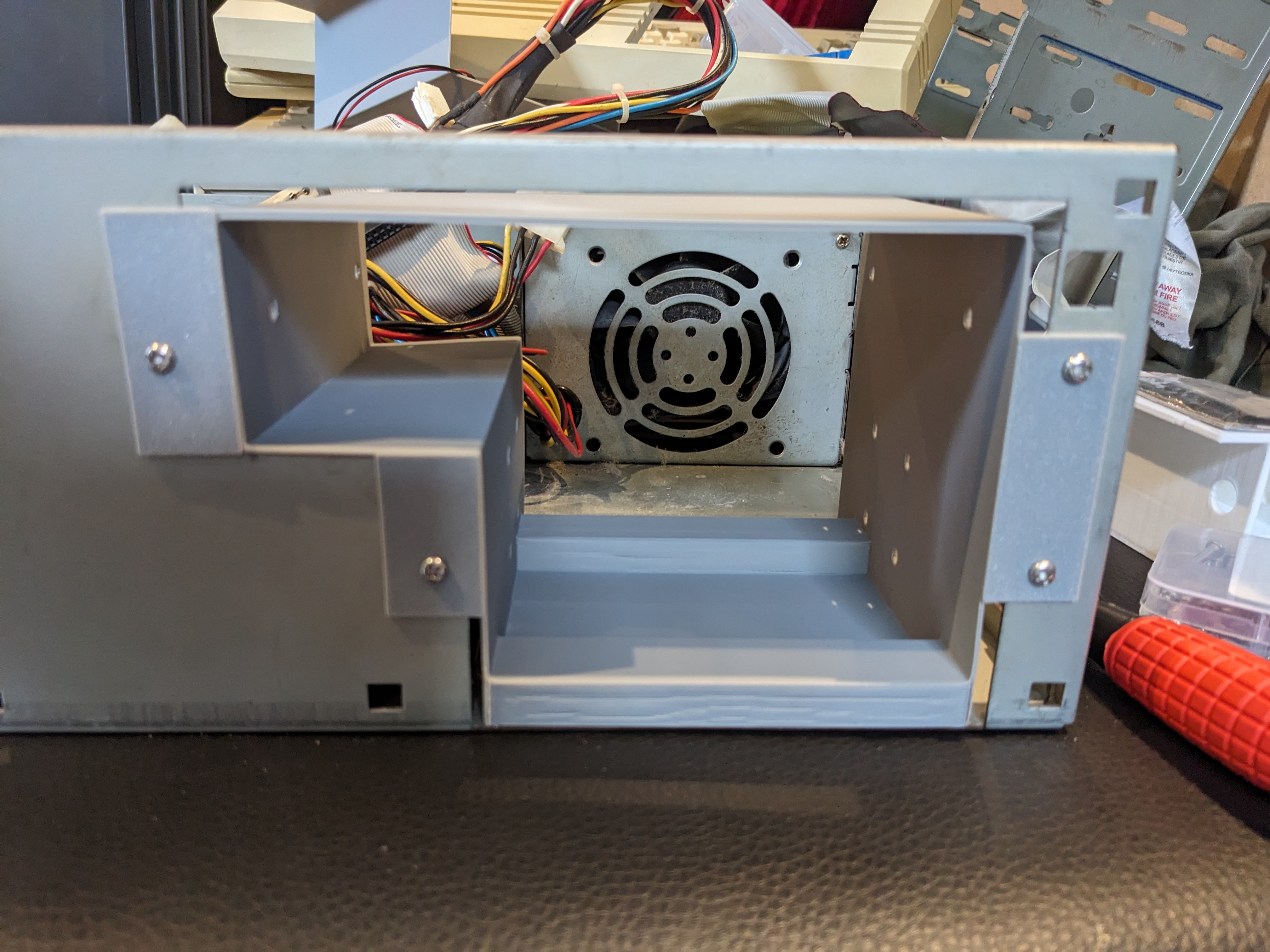 Whilst getting hold of a new drive cage is very difficult, I figured I might be able to 3D print one. Unfortunately, there is no design for one presently, it seems. Chris Appleton, aka Pillock on the RMC Retro Discord, measured his own one and gave me drawings to go from (many thanks!). Using this, I created a quick draft to see if it was structurally sound and would fit.