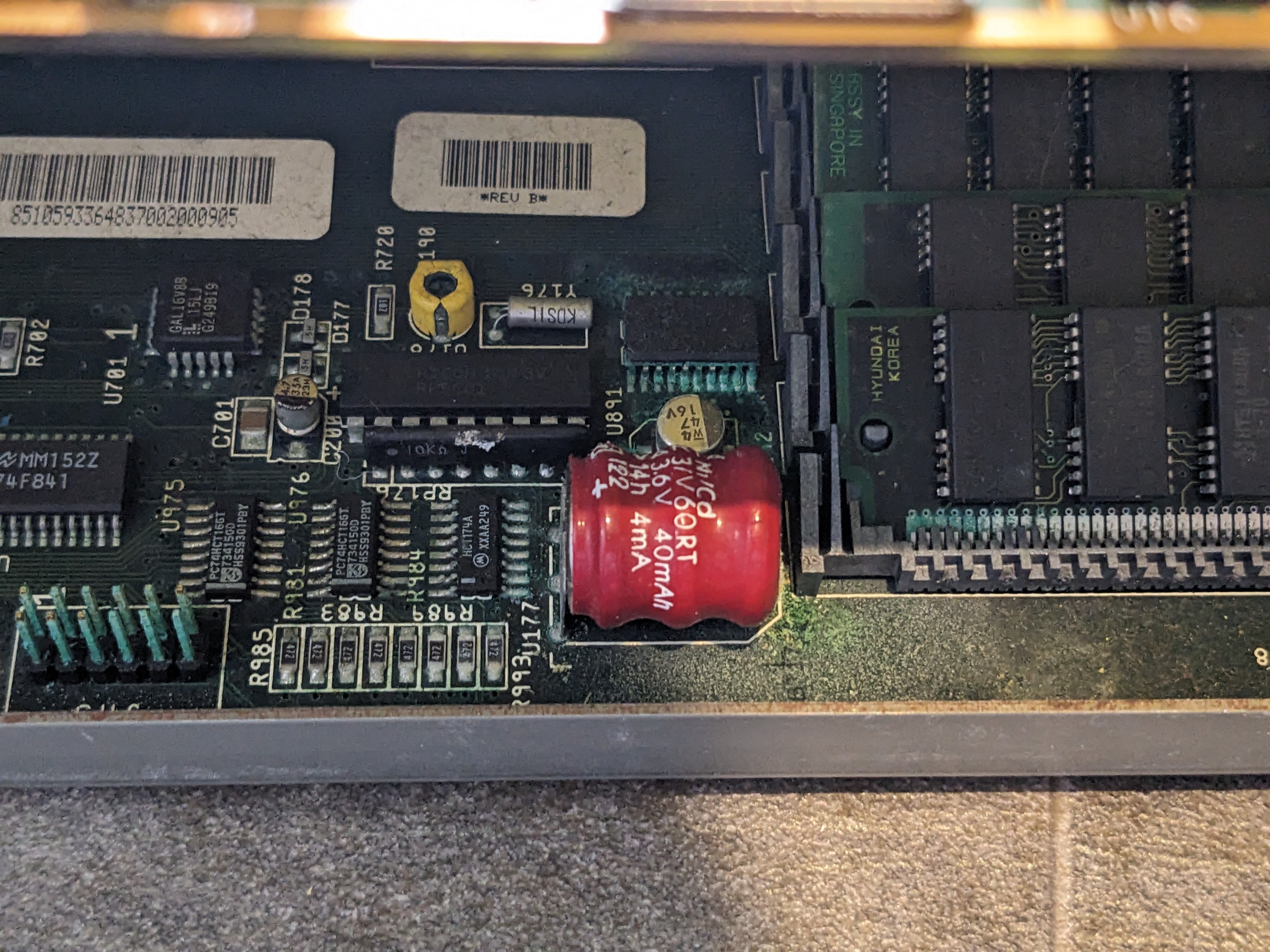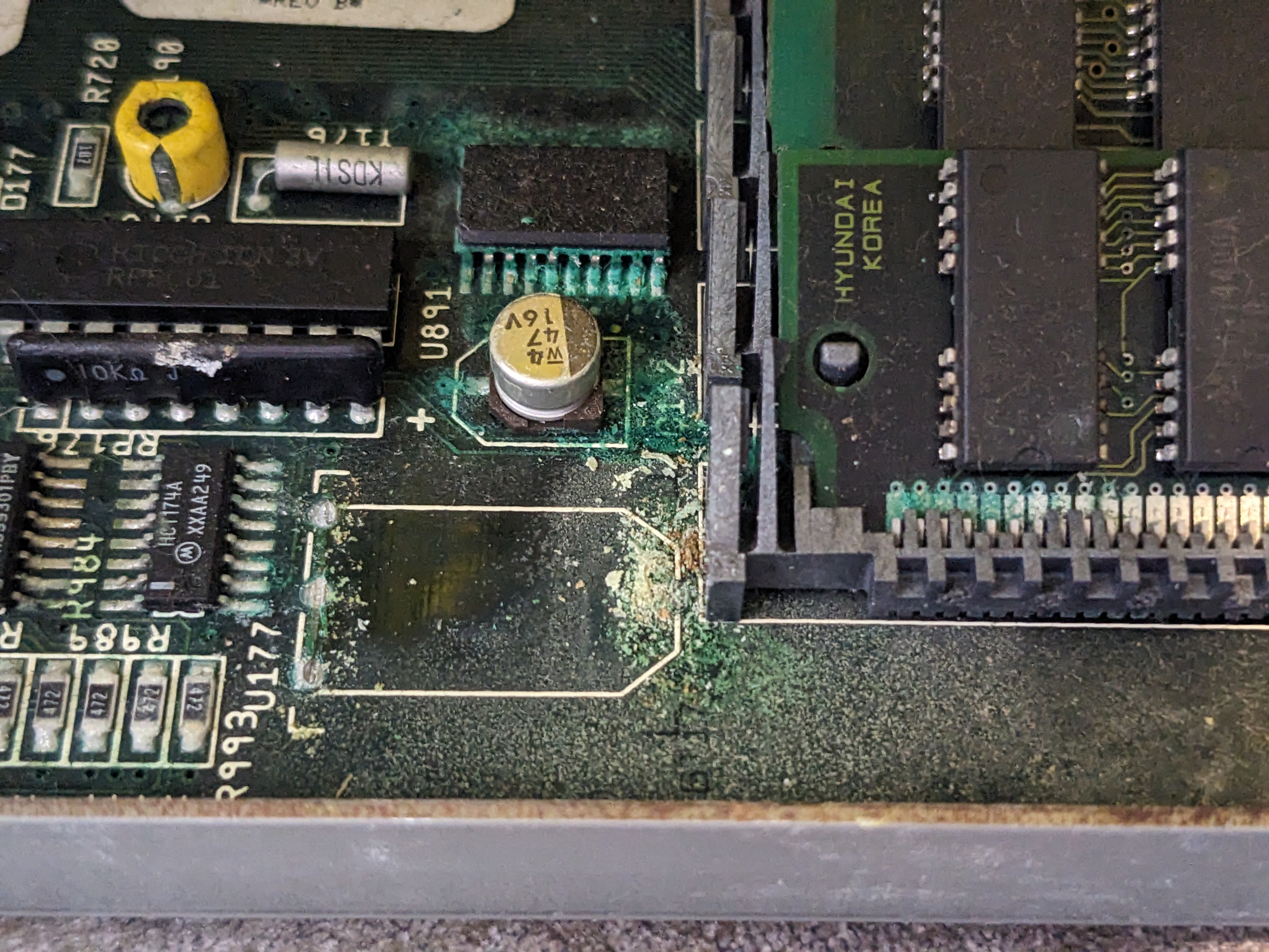I removed the battery and used some mild acid to give a first-past clean up the leakage around the battery area. Once this was cleaned off, I inspected the board around this area. It appears the capacitors have leaked too, so those are going to need to be replaced.