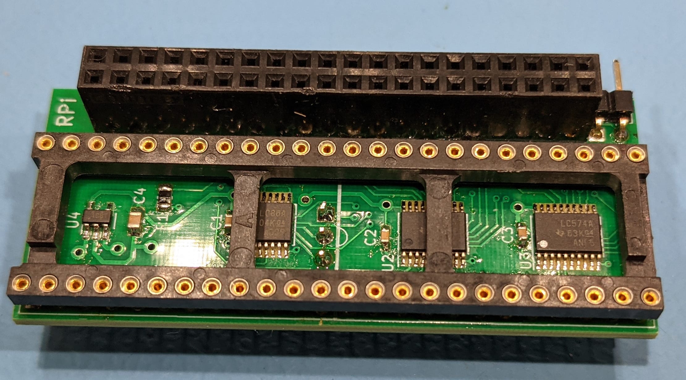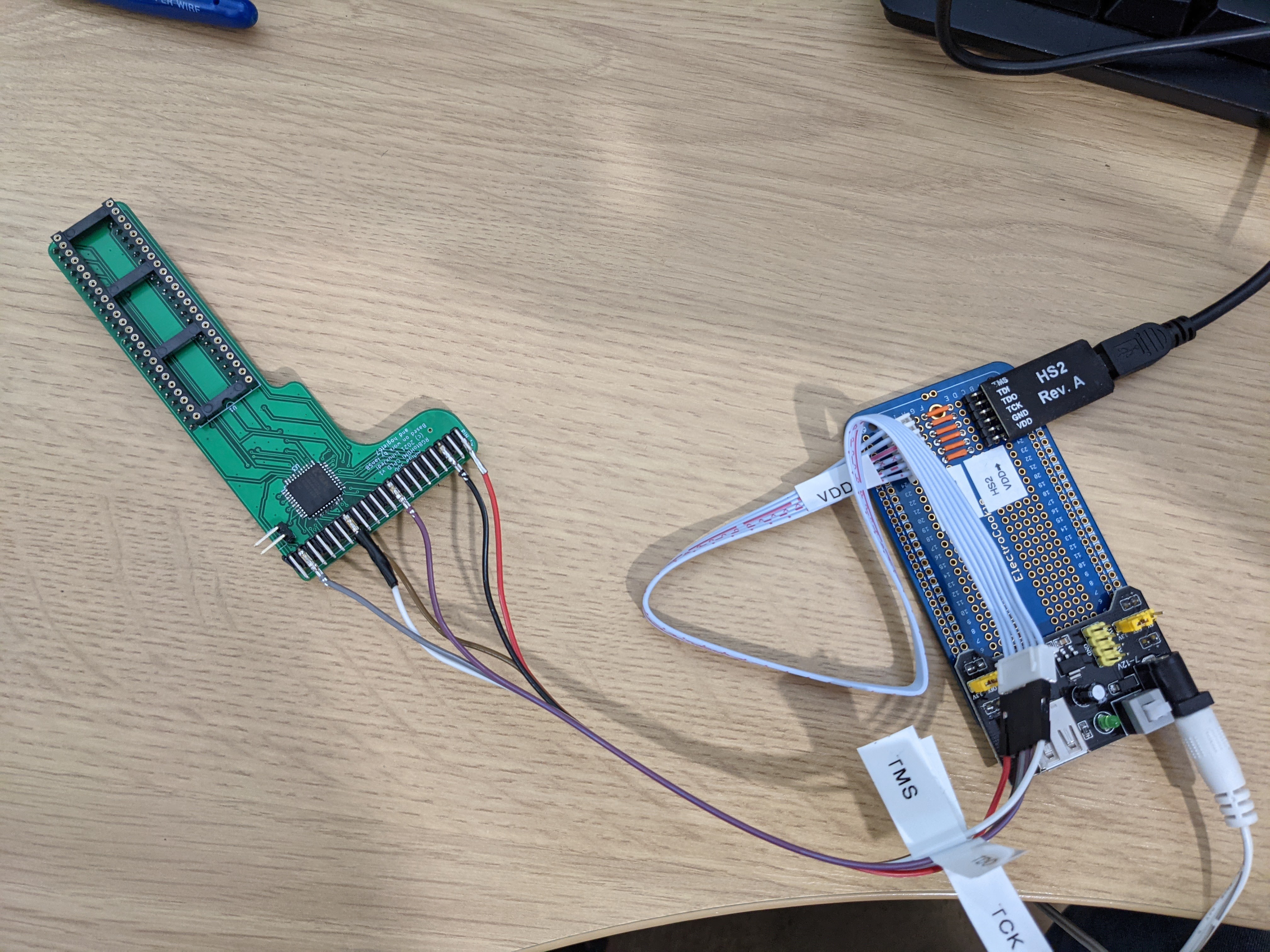 For subsequent boards I hacked together a connector for my JTAG programmer so I could flash the initial CPLD image from the Pi.