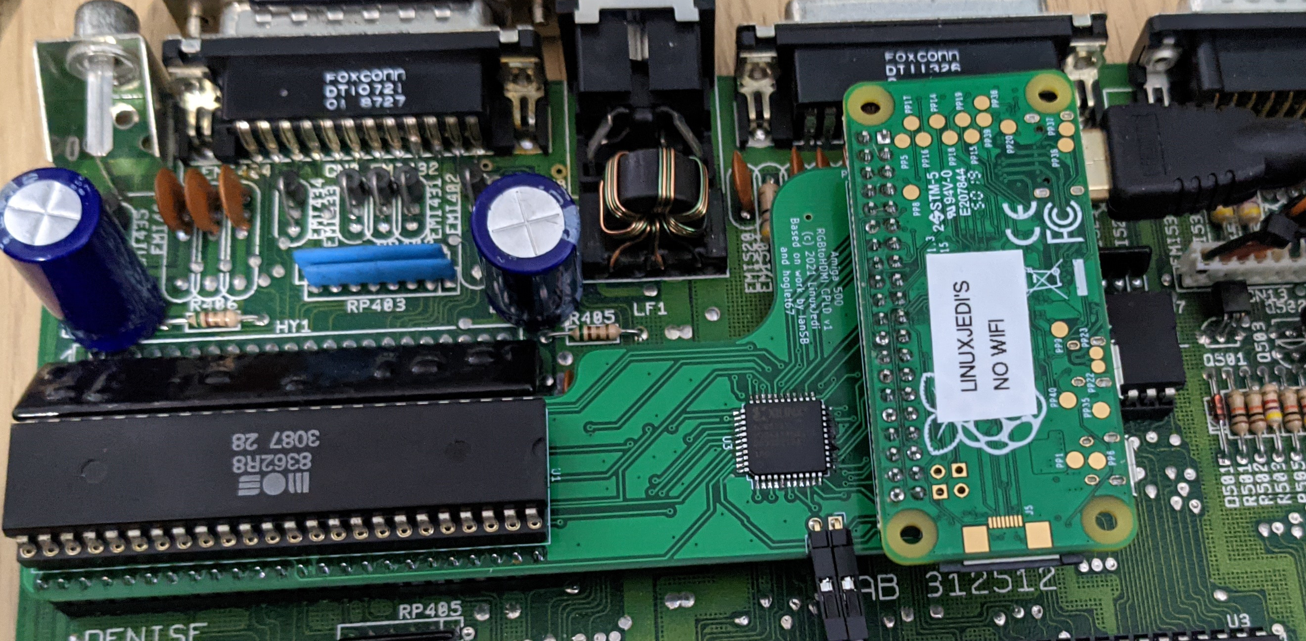 I agreed with IanSB’s assessment, but I figured with the Amiga a simpler physical implementation was possible. Instead of an adaptor board for Denise and a separate CPLD board for the Pi, I decided to combine everything into a single solution. I also made the design relocate the Pi to the side so that there was a much better clearance for accelerators.