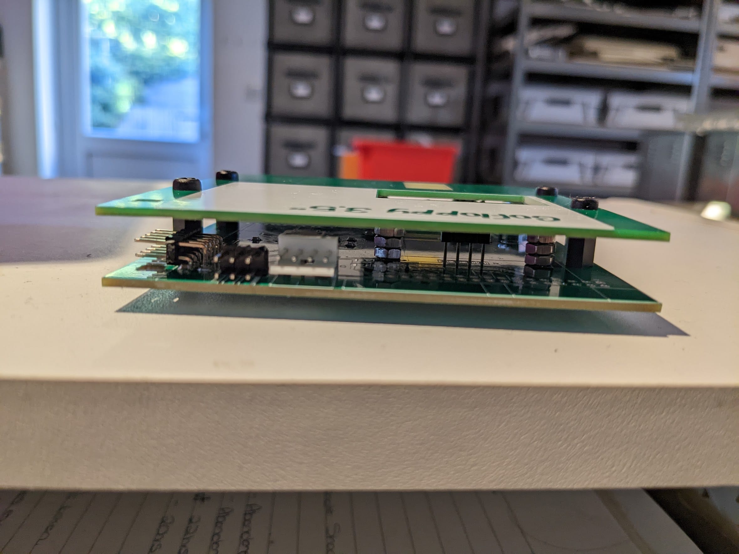 You can see here the first prototype device. This was before I had decided on a control method so I was using push buttons. This was much thicker (almost 2x) because the floppy connectors are on the inside instead of the bottom. You’ll notice the top board isn’t as detailed, the screen hole is too large. I also messed up and had the metal “shutter” covered in PCB mask.
