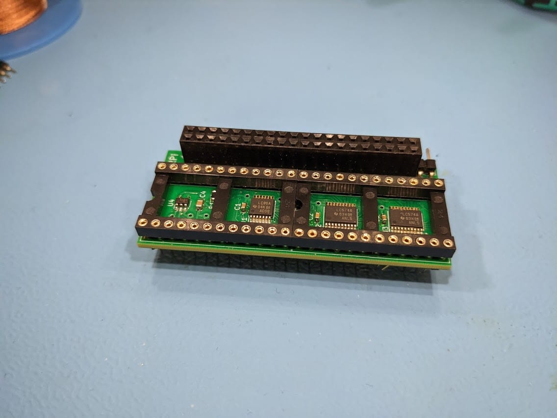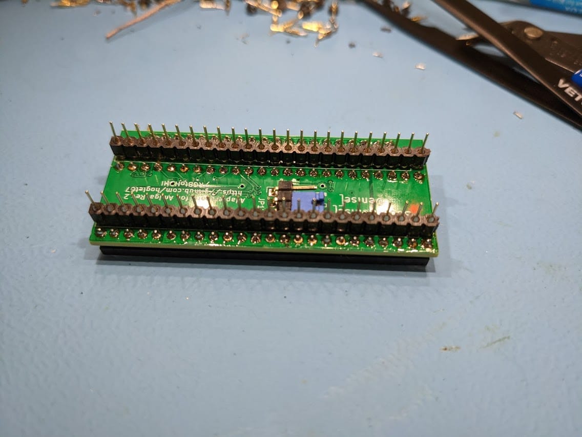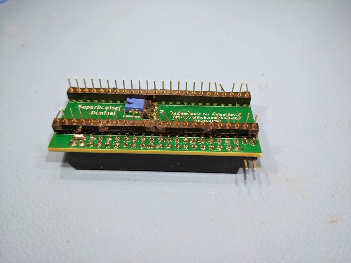 Now, unfortunately due to the configuration of the board I needed to get the Denise socket off the top of the board to expose the solder joints for the pins underneath. Even more unfortunate is that everything is so close together on the board I couldn’t use my desoldering gun without melting a lot of plastic. But as luck would have it, I had one socket left of the right size and had several strips of pins to go underneath.