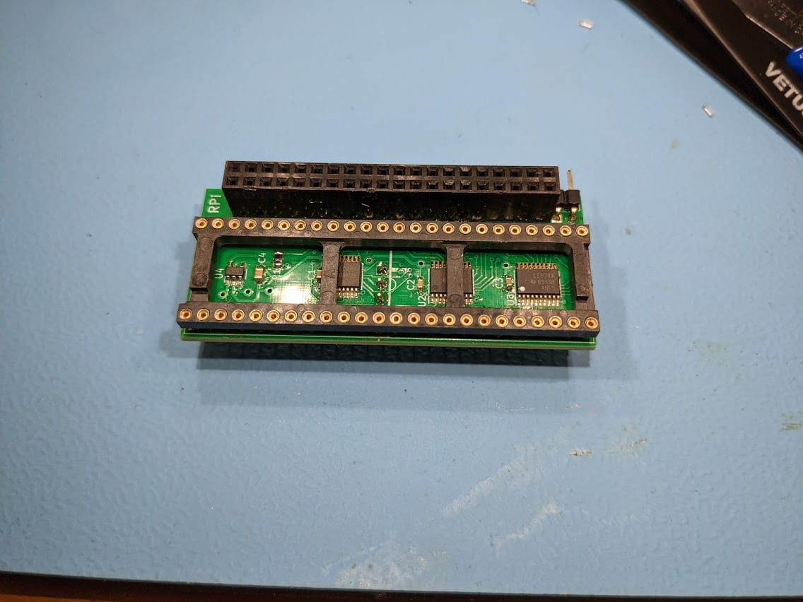 Denise sits on the chip socket there, there are pins underneath to go into the Denise socket and the Raspberry Pi goes into the header at the top.