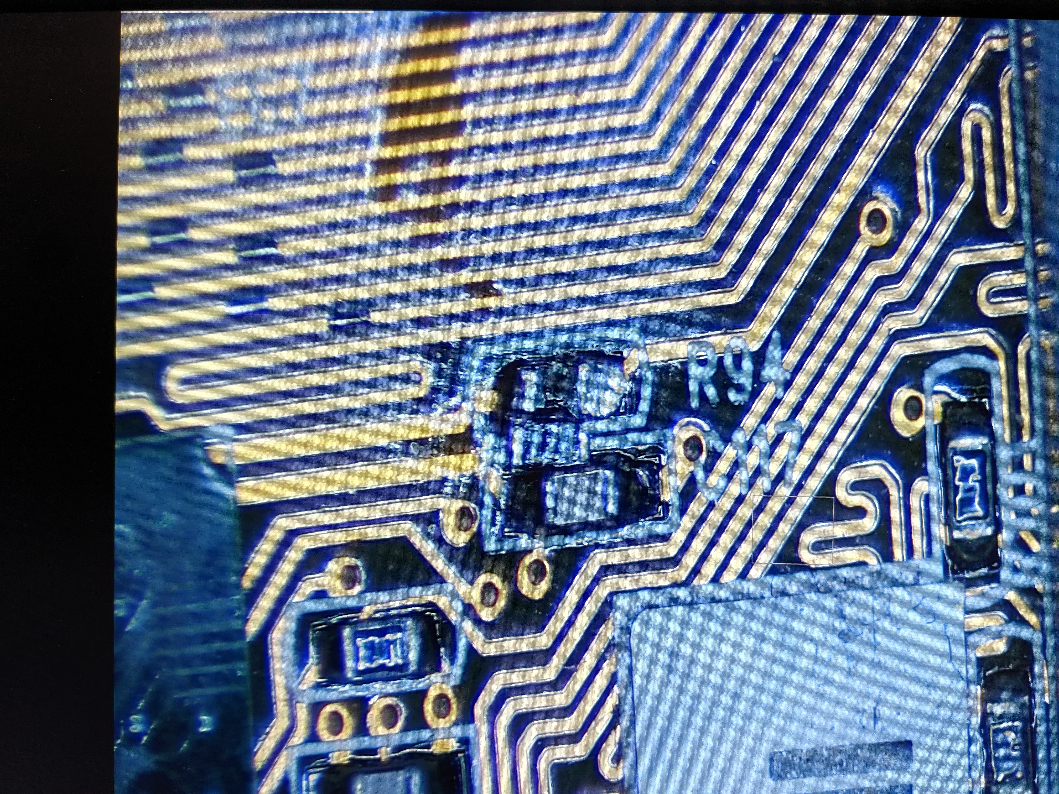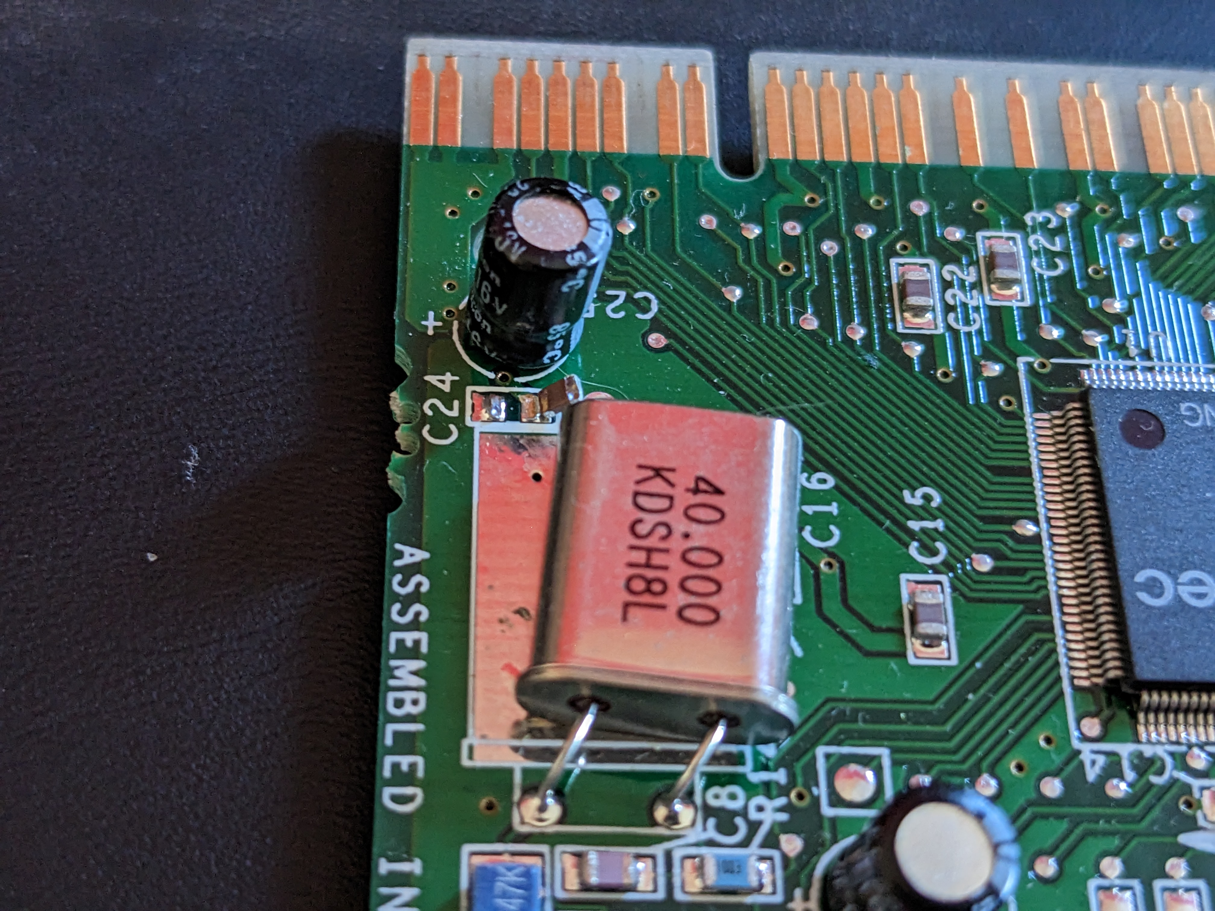 Sure enough, one of the load capacitors for the clock crystal had mostly broken off. I’m getting flashbacks to the Pentium 3 motherboard itself which was “tested working” and turned out to have an SMD component broken off, causing it not to function: