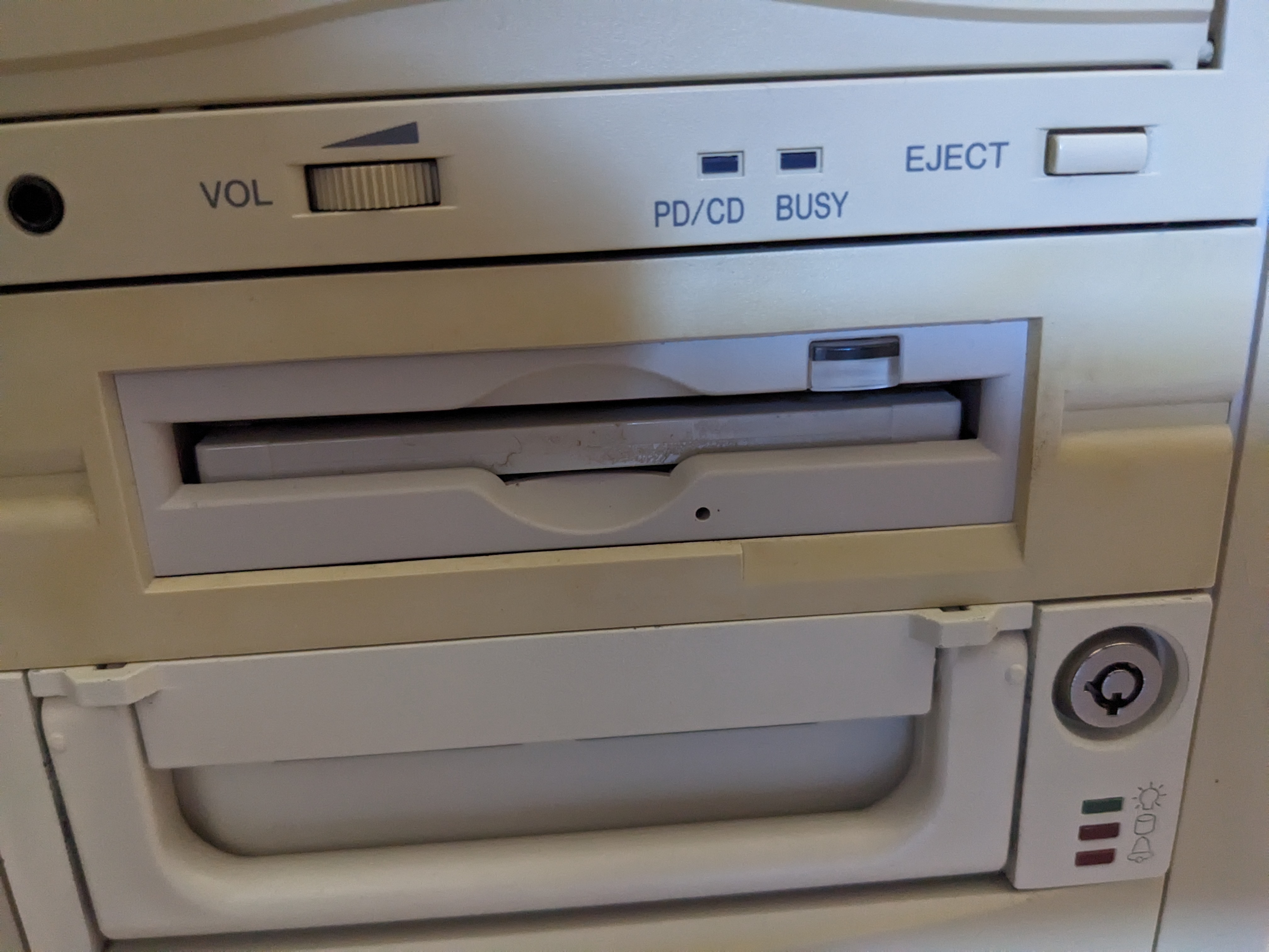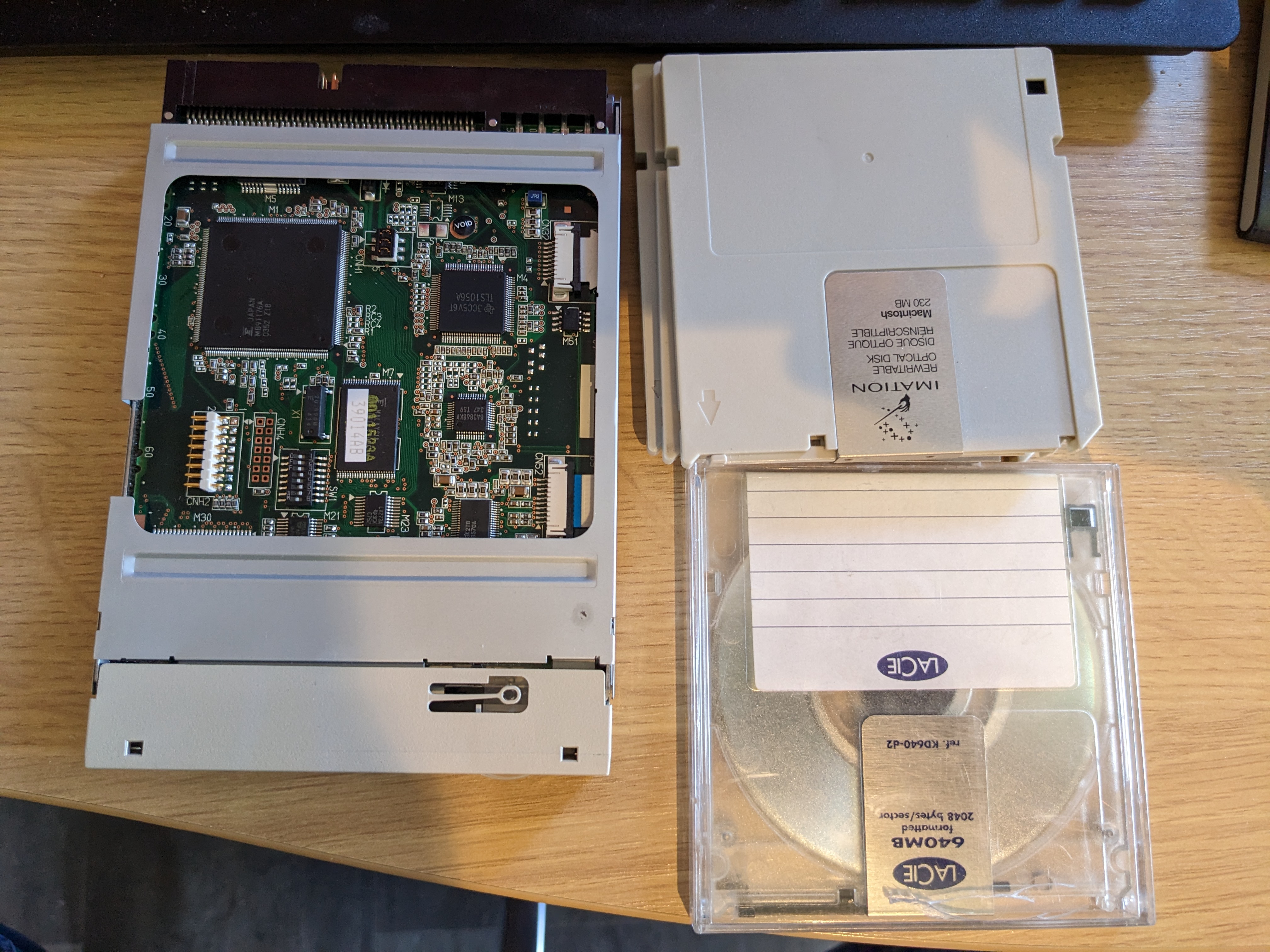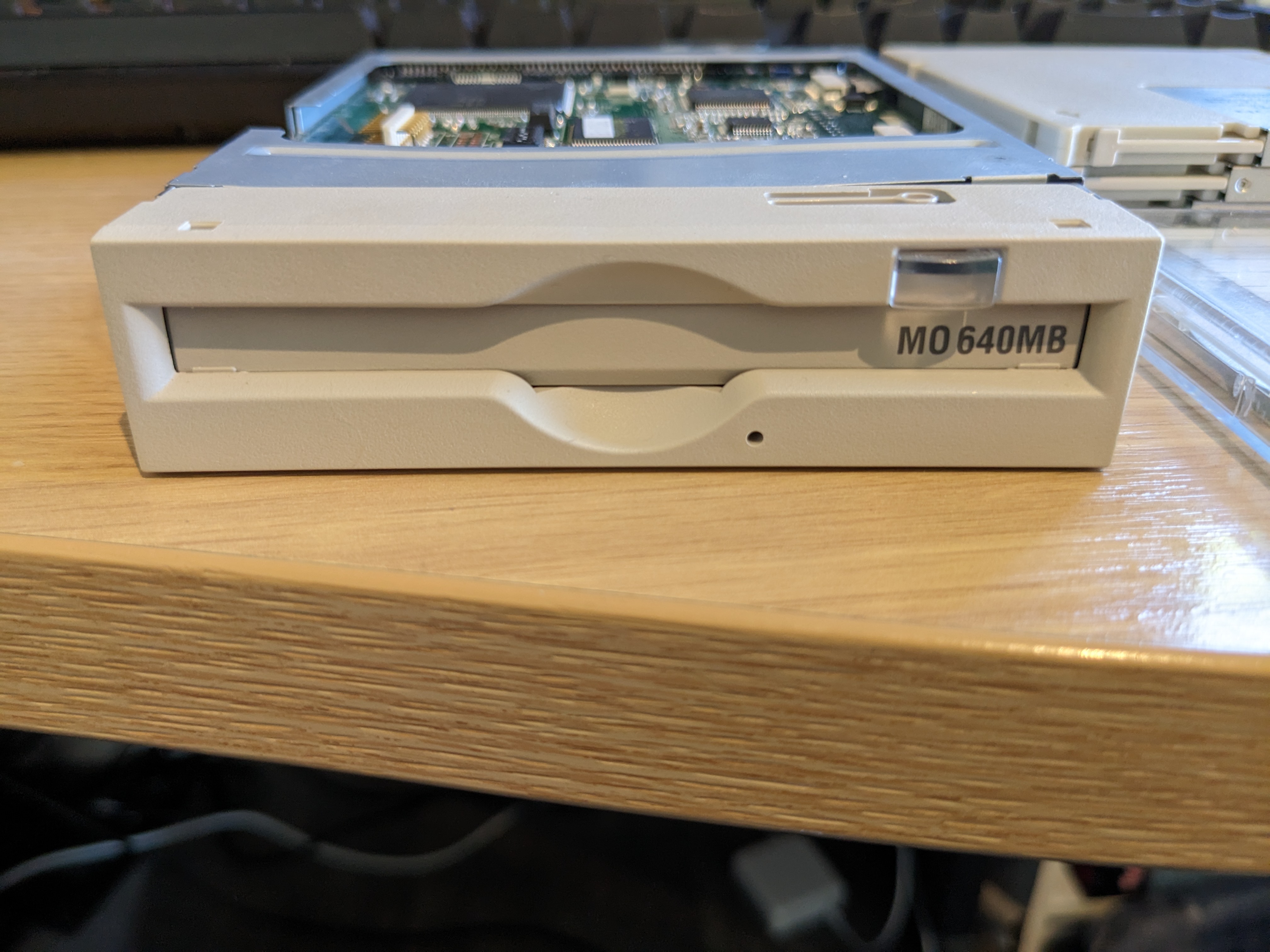 I had given up on the SyQuest drive and sold it via eBay with a full description of the problem with it and suggestions on how to fix it. I decided to replace it with a cool tech that would work with my hardware. After chatting to Fletch from some of the retro Discord communities I decided to to get a MO drive. MO stands for Magneto-Optical and it is a sort-of half-way house between a removable magnetic media and a CD. It uses a laser to read and write, but during write the laser is just used to heat and a magnetic write head changes the pattern on the disc.