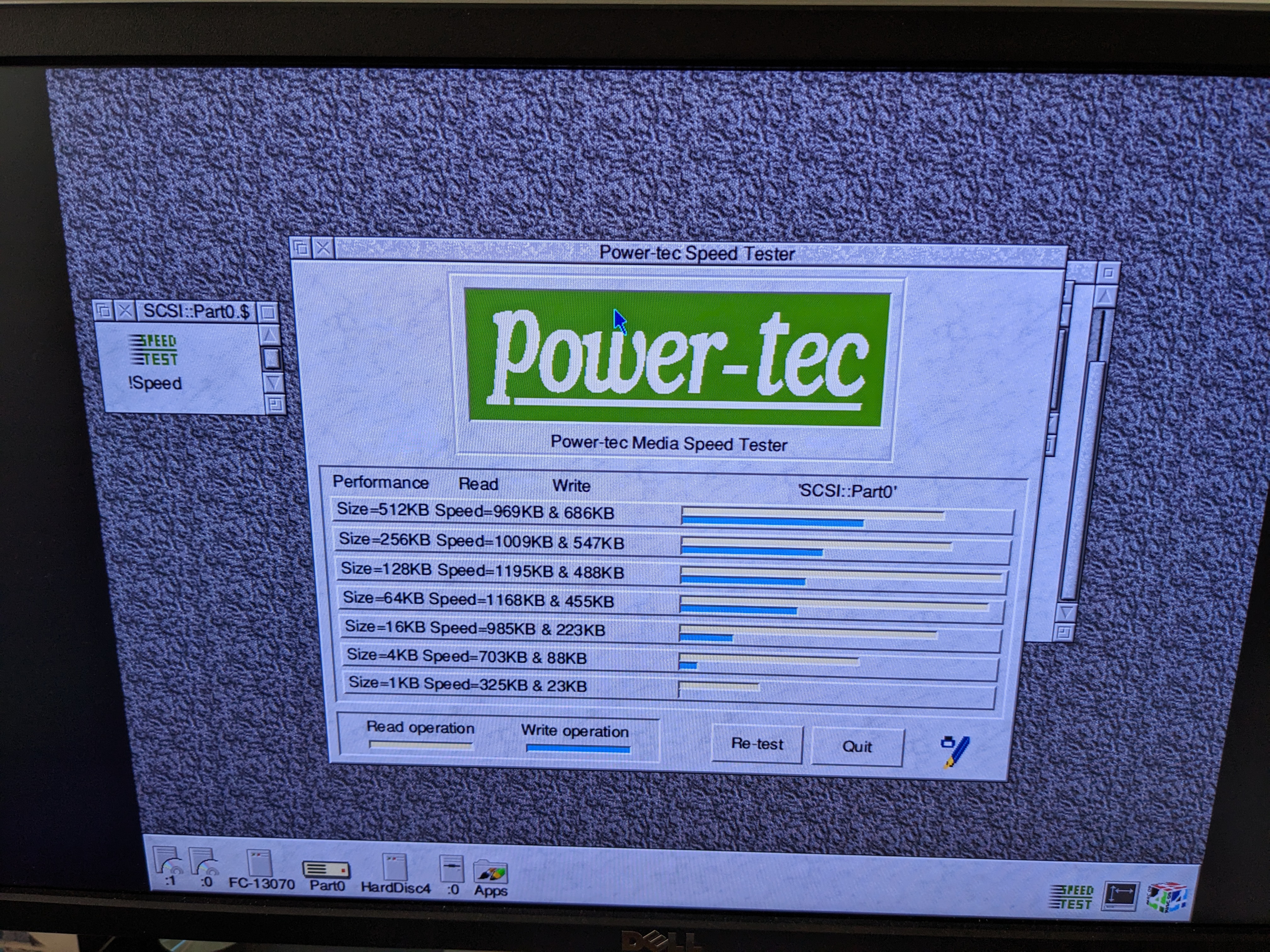 I put a 230MB disc into it, partitioned it on the RiscPC and assigned it a drive on the SCSI card. It then popped up as a drive I could use and I ran a quick benchmark on it.