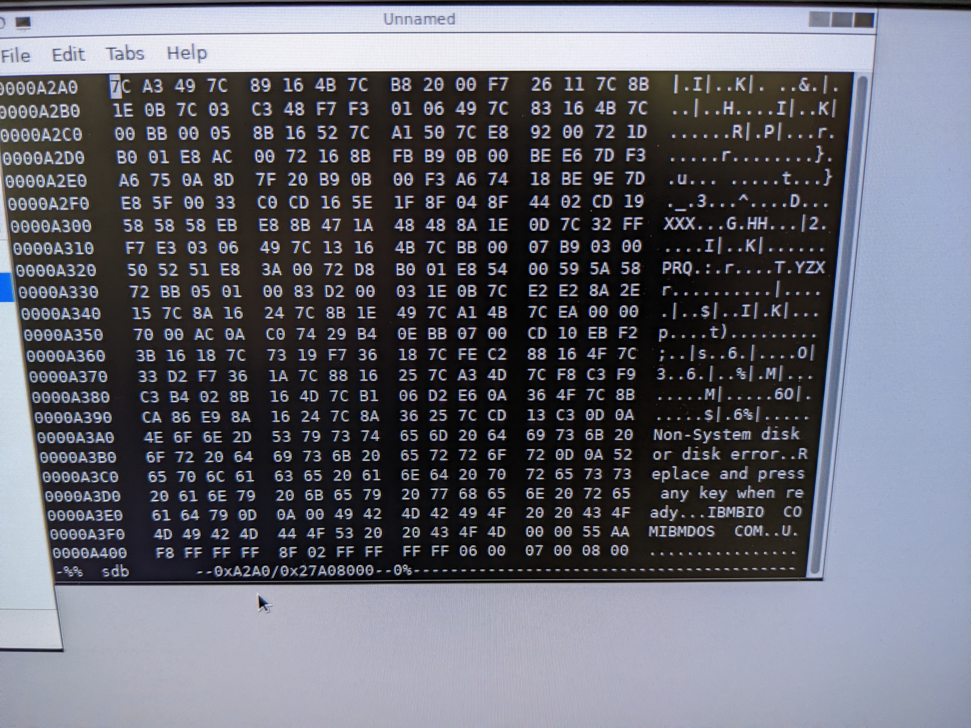 I figured the best chance I had to read the disc was to use a Linux OS, I settled on GParted Live as that might find the partitions. Unfortunately it couldn’t see any partitions or figure out how to mount it, but I ran hexedit on it to be sure. The first few pages were definitely blank, but then I saw data which looked like a DOS partition.
