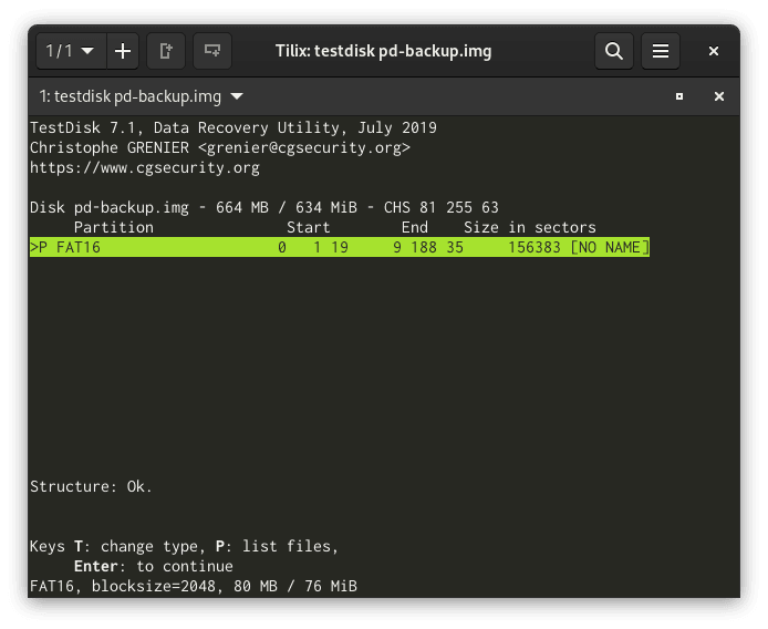 I made an image of the entire disc on a USB stick and moved it over to my Linux laptop to work on. There I used a tool called “Testdisk” which managed to find a FAT16 partition in the disc.